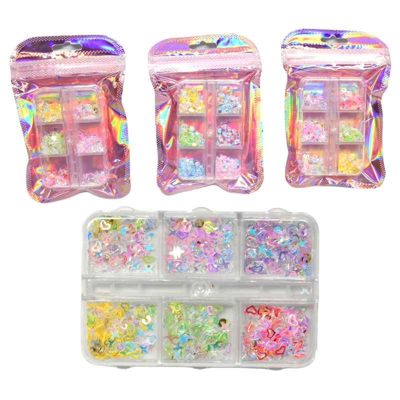Decoraciones para uñas estrellas y corazones empaque rosado brillante
