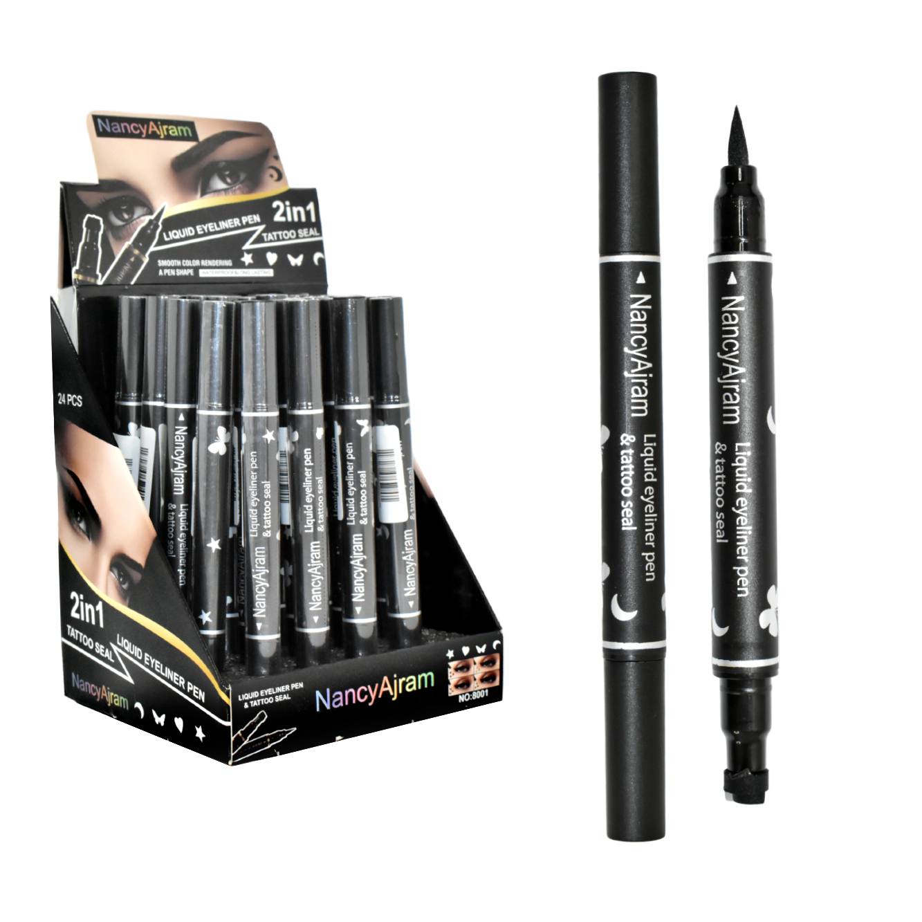 Nuestros nuevos delineadores 2 en 1 en tono negro son perfectos, de un lado es un delineador de ojos negro, el otro lado es un lápiz de tatuaje con sello delineador de ojos. Se seca rápidamente y mantiene los patrones de delineador de ojos fuertes, hará que el maquillaje no sea monótono.