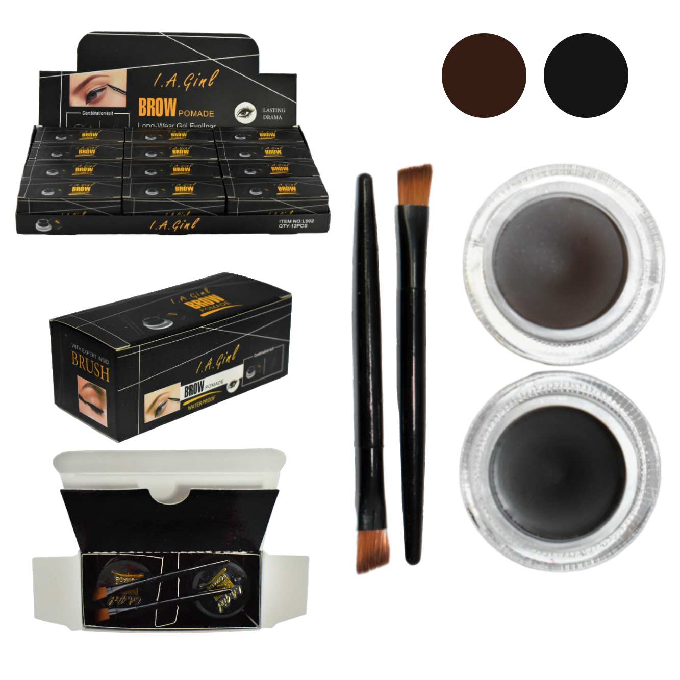 1 Pomada para cejas en tono café oscuro – 1 Pomada para cejas en tono café claro – 2 brochas biseladas para cejas.