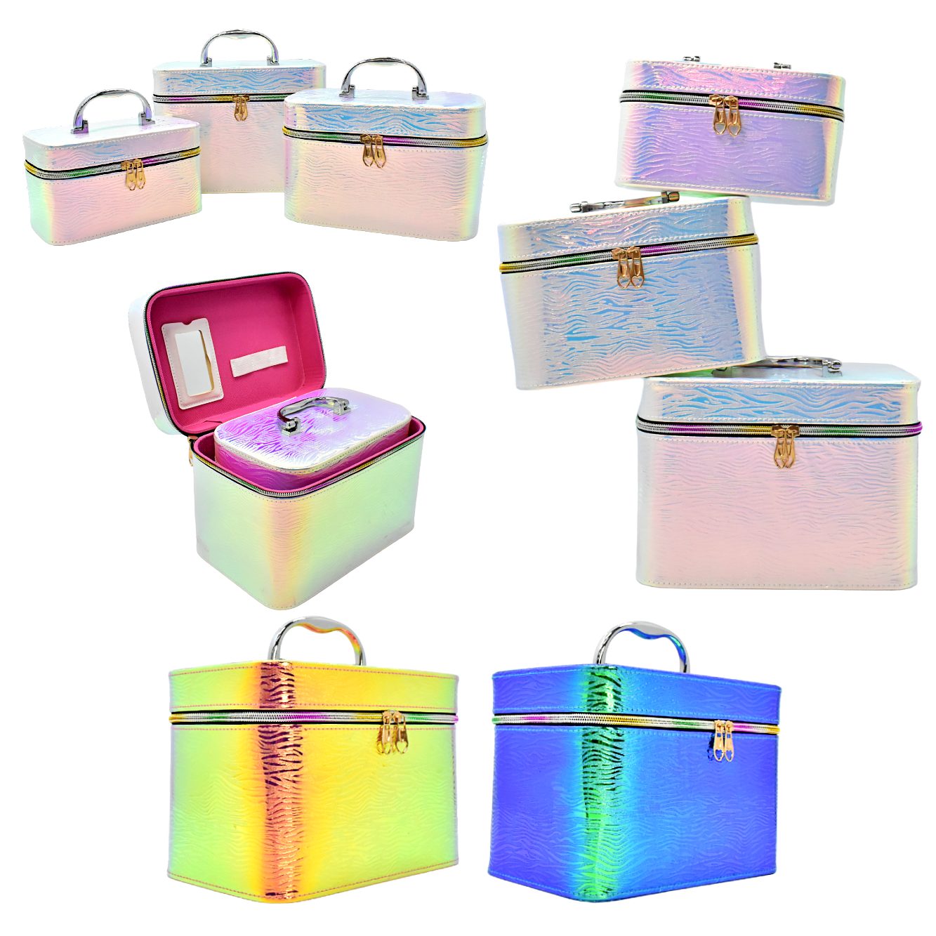 Kit de 3 cosmetiqueras rectangulares con diseño de maleta y variedad de colores brillantes holográficos. Son ideales para almacenar cosméticos de belleza. accesorios, carteras, prendas pequeñas y muchos artículos más que utilices en el diario vivir.